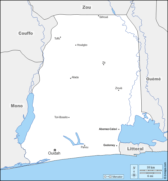 d-maps > Afrique > Bénin > Département de l'Atlantique > frontières, hydrographie, principales villes, noms