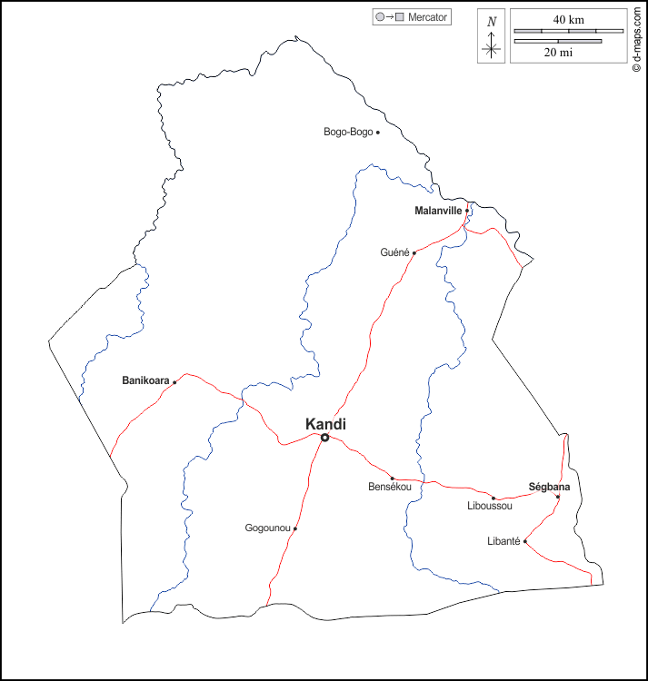 d-maps > Afrique > Bénin > Département de l'Alibori > contours, hydrographie, principales villes, routes, noms, blanc