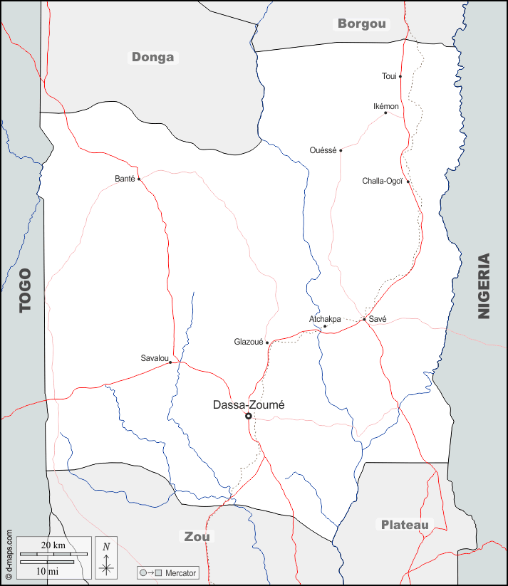 d-maps > Afrique > Bénin > Département des Collines > frontières, hydrographie, principales villes, routes, noms