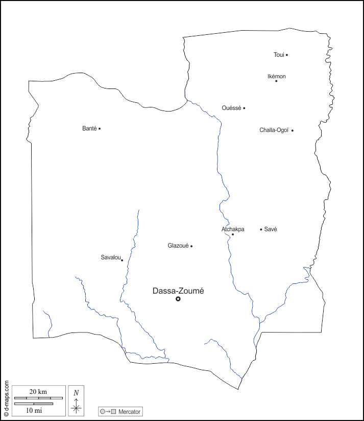 d-maps > Afrique > Bénin > Département des Collines > contours, hydrographie, principales villes, noms, blanc