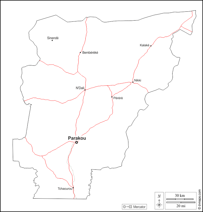 d-maps > Afrique > Bénin > Département de Borgou > contours, principales villes, routes, noms, blanc