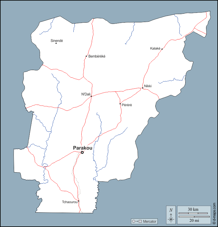d-maps > Afrique > Bénin > Département de Borgou > contours, hydrographie, principales villes, routes, noms