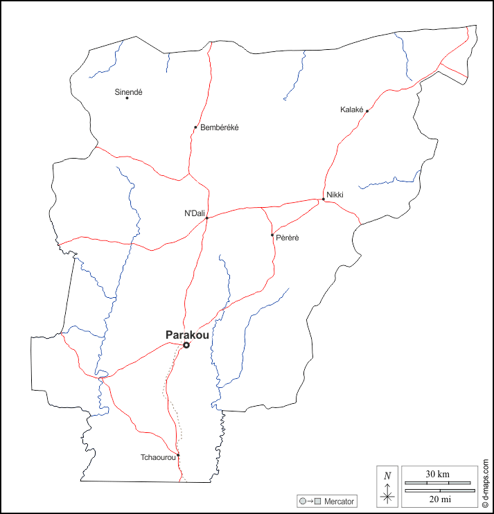 d-maps > Afrique > Bénin > Département de Borgou > contours, hydrographie, principales villes, routes, noms, blanc