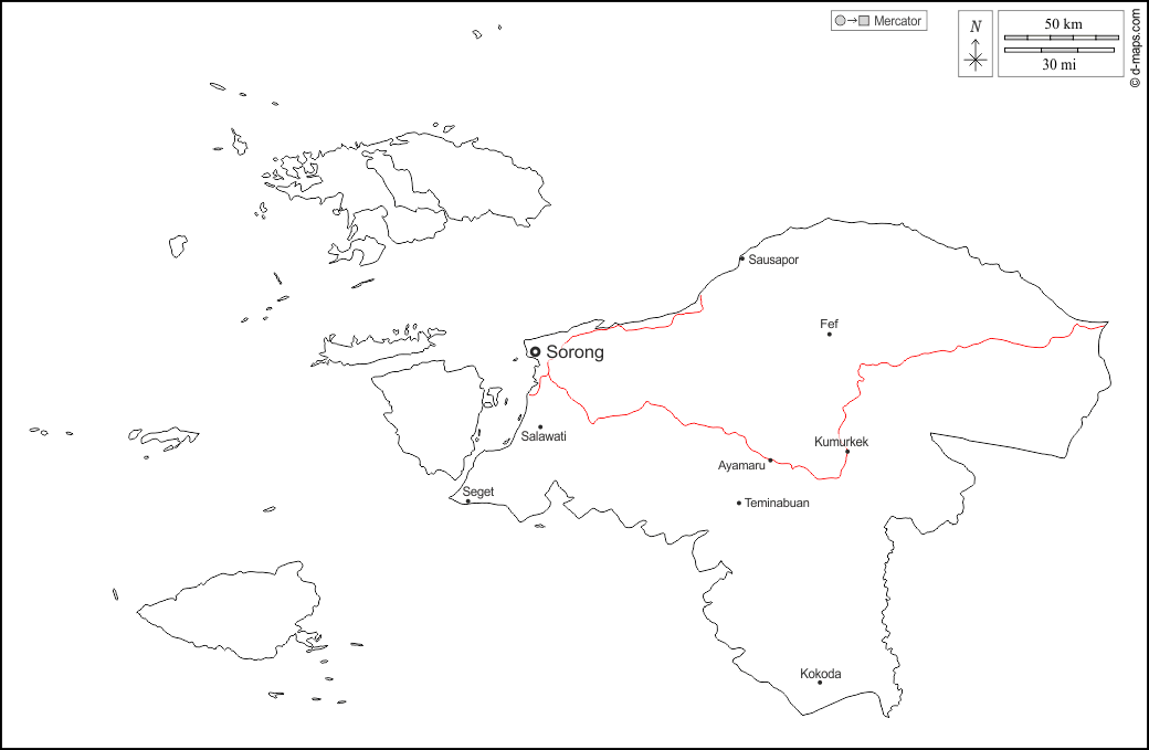 d-maps > Asie > Indonésie > Papouasie du Sud-Ouest > contours, principales villes, routes, noms, blanc