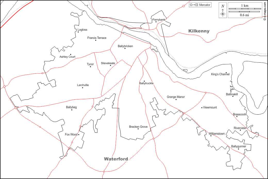 d-maps > यूरोप > आयरलैण्ड गणतंत्र > वाटरफोर्ड सिटी > सीमाओं, पड़ोस, सड़कों, नाम, सफेद