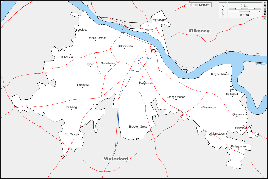 d-maps > यूरोप > आयरलैण्ड गणतंत्र > वाटरफोर्ड सिटी > सीमाओं, जल-सर्वेक्षण, पड़ोस, सड़कों, नाम