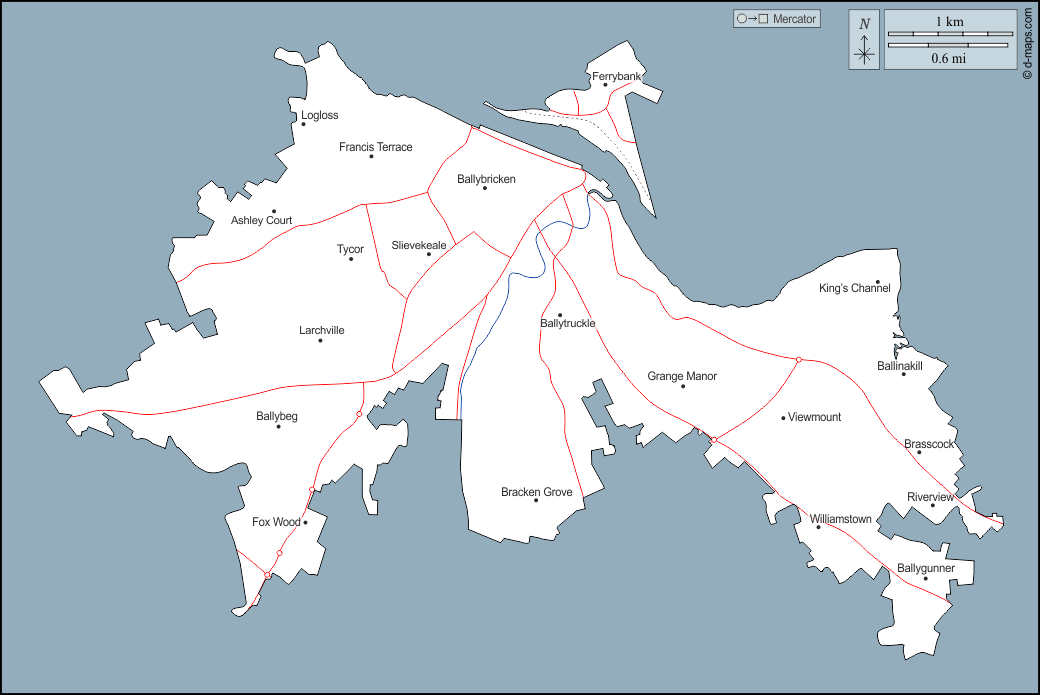 d-maps > यूरोप > आयरलैण्ड गणतंत्र > वाटरफोर्ड सिटी > बाह्यरेखा, जल-सर्वेक्षण, पड़ोस, सड़कों, नाम