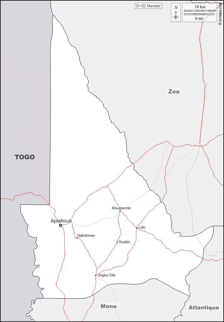 d-maps > अफ्रीका > बेनिन > कूफ़ो विभाग > सीमाओं, मुख्य शहरों, सड़कों, नाम