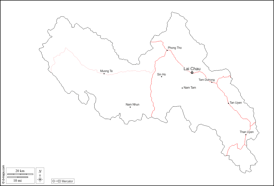 d-maps > एशिया > वियतनाम > लाई चाउ प्रांत > बाह्यरेखा, मुख्य शहरों, सड़कों, नाम, सफेद