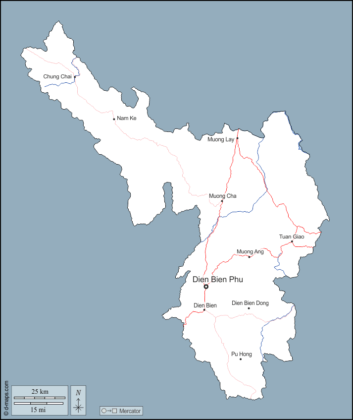 d-maps > एशिया > वियतनाम > डिएन बिएन प्रांत > बाह्यरेखा, जल-सर्वेक्षण, मुख्य शहरों, सड़कों, नाम