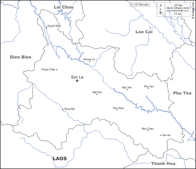 d-maps > एशिया > वियतनाम > सौन ला प्रान्त > सीमाओं, जल-सर्वेक्षण, मुख्य शहरों, नाम, सफेद