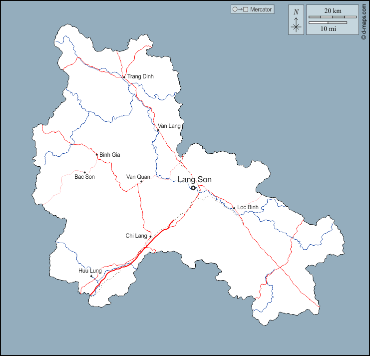 d-maps > एशिया > वियतनाम > लैंग सोन प्रान्त > बाह्यरेखा, जल-सर्वेक्षण, मुख्य शहरों, सड़कों, नाम