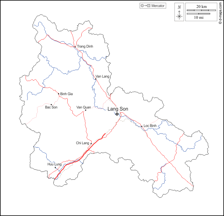 d-maps > एशिया > वियतनाम > लैंग सोन प्रान्त > बाह्यरेखा, जल-सर्वेक्षण, मुख्य शहरों, सड़कों, नाम, सफेद