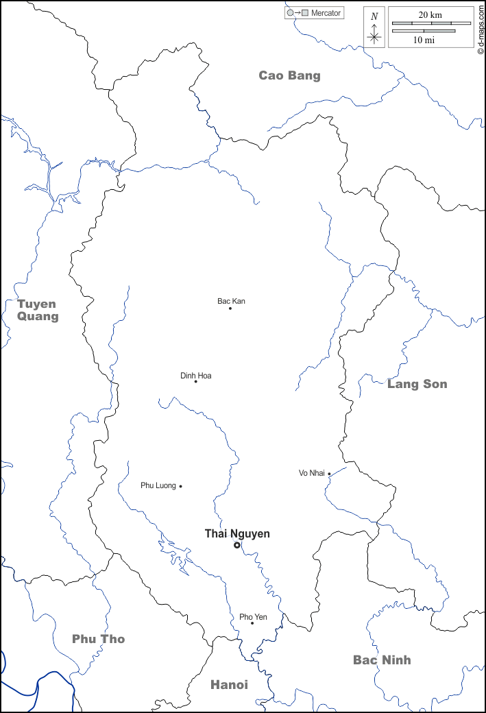 d-maps > एशिया > वियतनाम > थाई न्गुयेन प्रांत > सीमाओं, जल-सर्वेक्षण, मुख्य शहरों, नाम, सफेद
