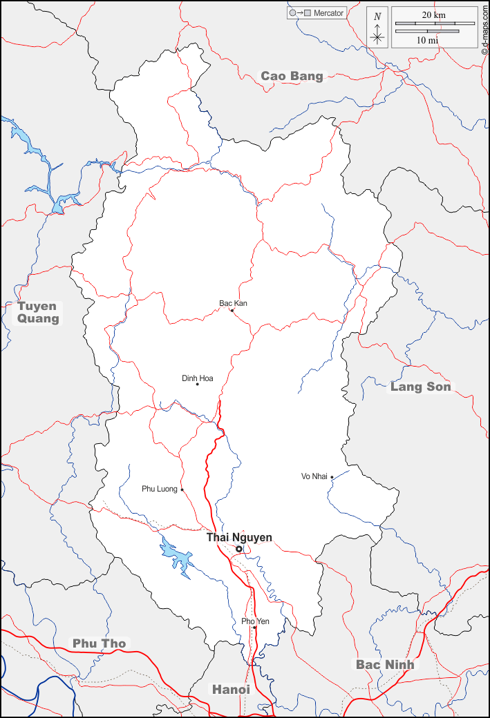 d-maps > एशिया > वियतनाम > थाई न्गुयेन प्रांत > सीमाओं, जल-सर्वेक्षण, मुख्य शहरों, सड़कों, नाम
