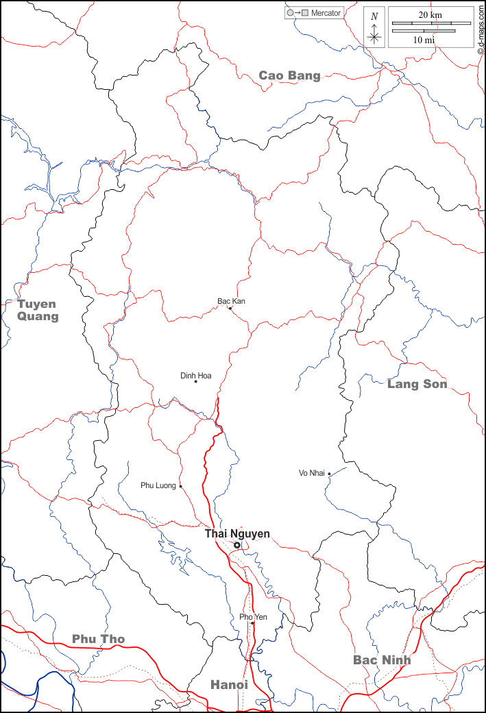 d-maps > एशिया > वियतनाम > थाई न्गुयेन प्रांत > सीमाओं, जल-सर्वेक्षण, मुख्य शहरों, सड़कों, नाम, सफेद