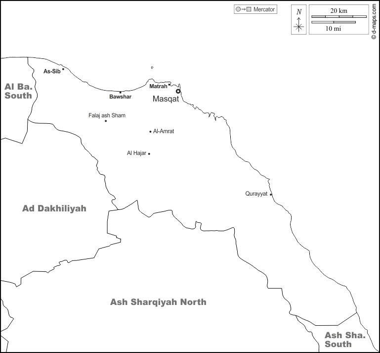 d-maps > ओमान > मस्कट गवर्नरेट > सीमाओं, मुख्य शहरों, नाम, सफेद