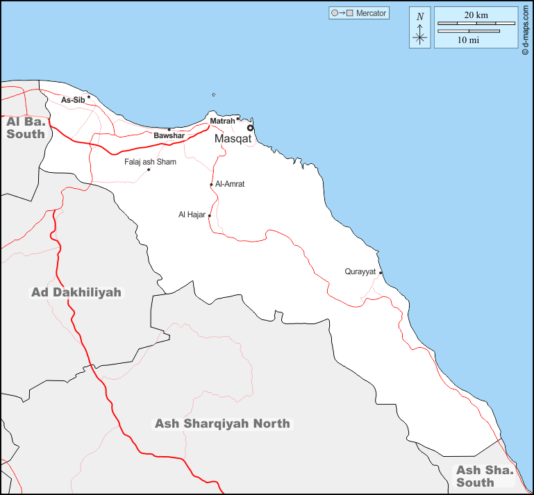 d-maps > ओमान > मस्कट गवर्नरेट > सीमाओं, मुख्य शहरों, सड़कों, नाम
