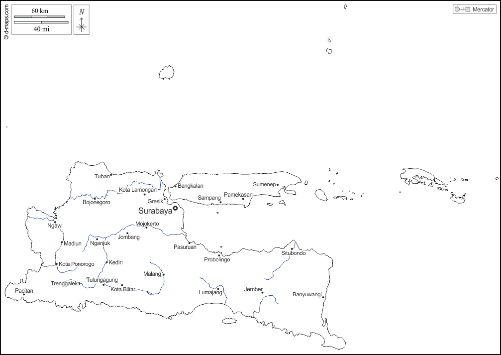 Asia > Indonesia > Giava orientale > contorni, idrografia, principali città, nomi, bianco