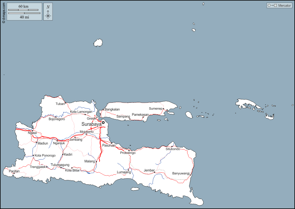 Asia > Indonesia > Giava orientale > contorni, idrografia, principali città, strade, nomi