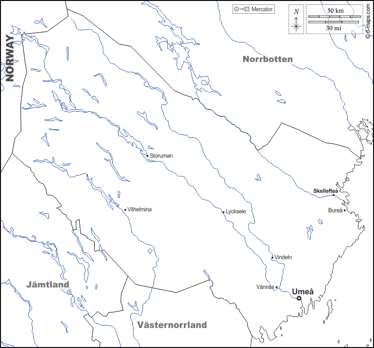 d-maps > Europa > Svezia > Västerbotten > frontiere, idrografia, principali città, nomi, bianco