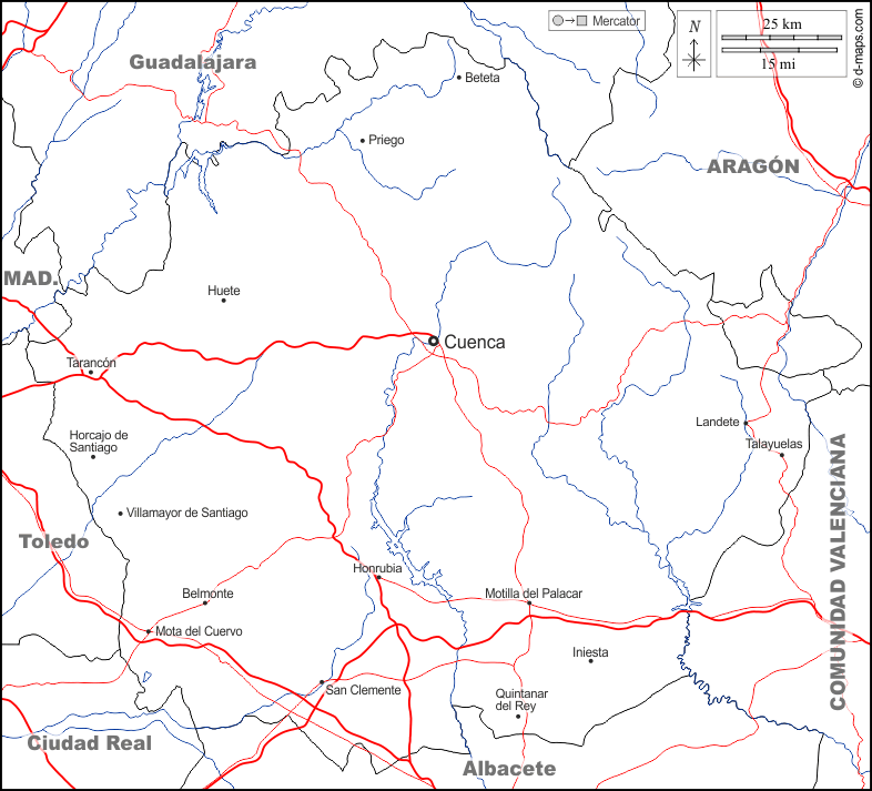 Europa > Spagna > Cuenca > frontiere, idrografia, principali città, strade, nomi, bianco