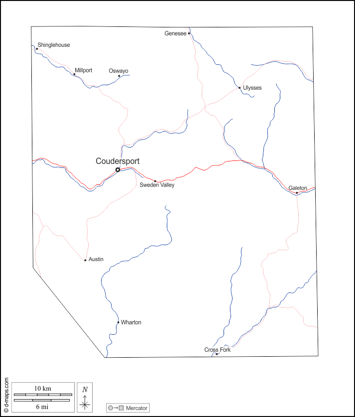 d-maps > Stati Uniti d'America (USA) > Pennsylvania > Contea di Potter > contorni, idrografia, principali città, strade, nomi, bianco