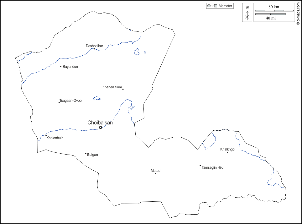 d-maps > Asia > Mongolia > Dornod > contorni, idrografia, principali città, nomi, bianco
