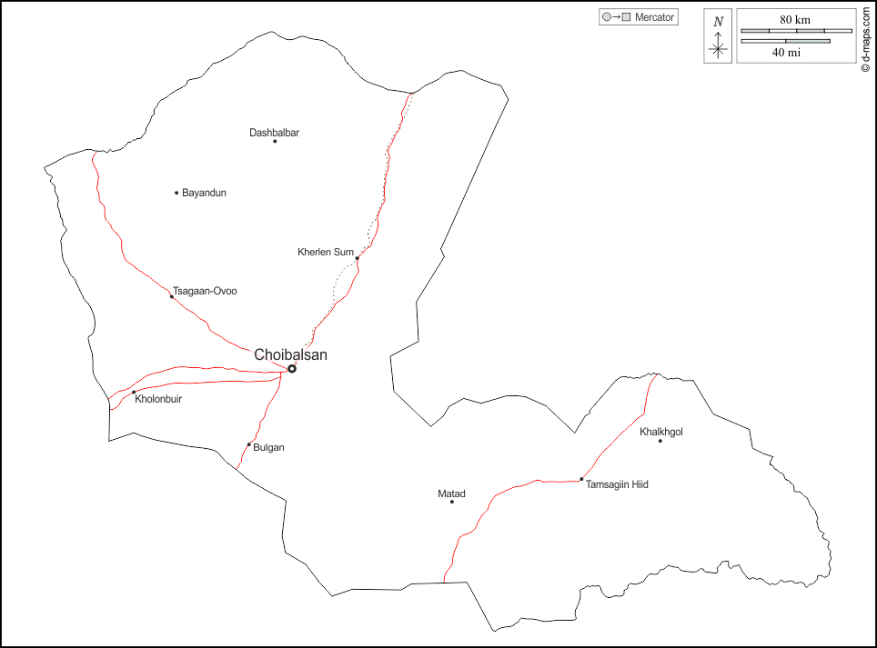 d-maps > Asia > Mongolia > Dornod > contorni, principali città, strade, nomi, bianco
