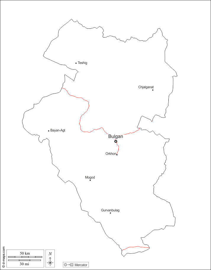 d-maps > Asia > Mongolia > Bulgan > contorni, principali città, strade, nomi, bianco