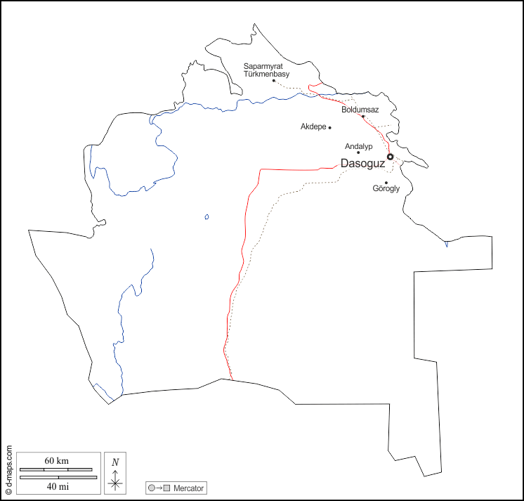 Asia > Turkmenistan > Daşoguz > contorni, idrografia, principali città, strade, nomi, bianco