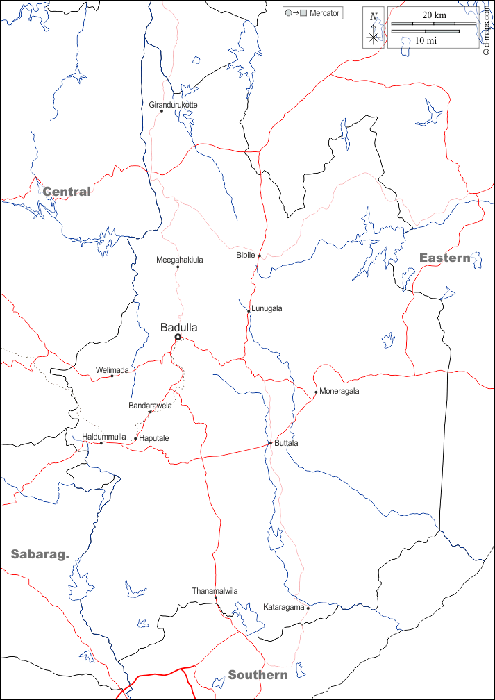 d-maps > Asia > Sri Lanka > Provincia di Uva > frontiere, idrografia, principali città, strade, nomi, bianco