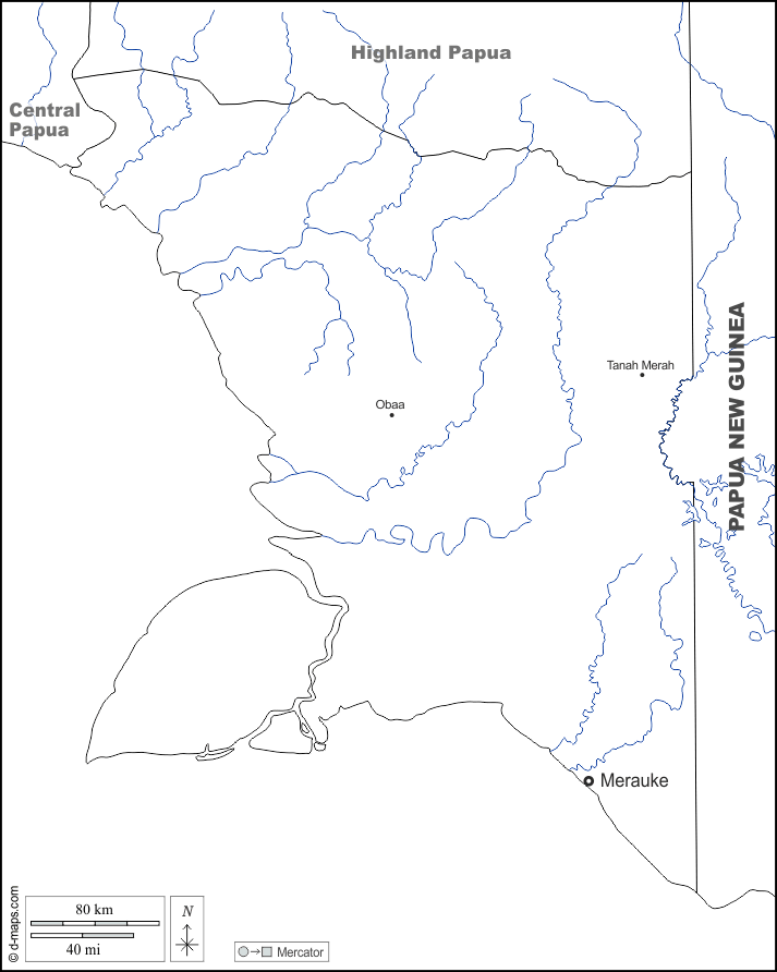 d-maps > Asia > Indonesia > Papua meridionale > frontiere, idrografia, principali città, nomi, bianco