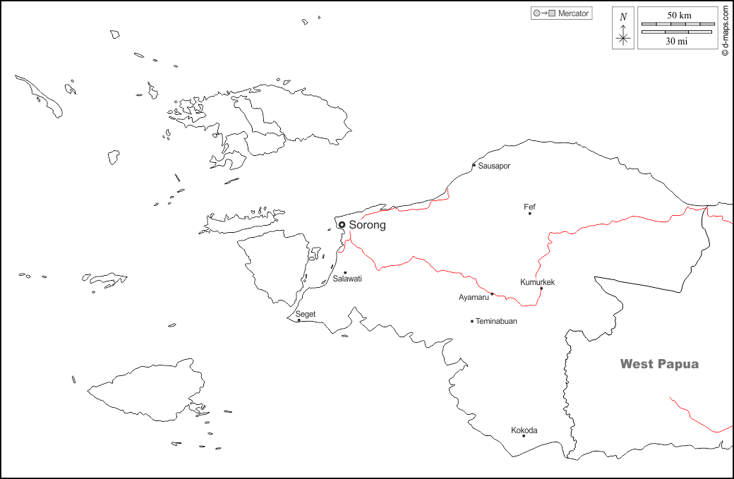 d-maps > Asia > Indonesia > Papua sud-occidentale > frontiere, principali città, strade, nomi, bianco