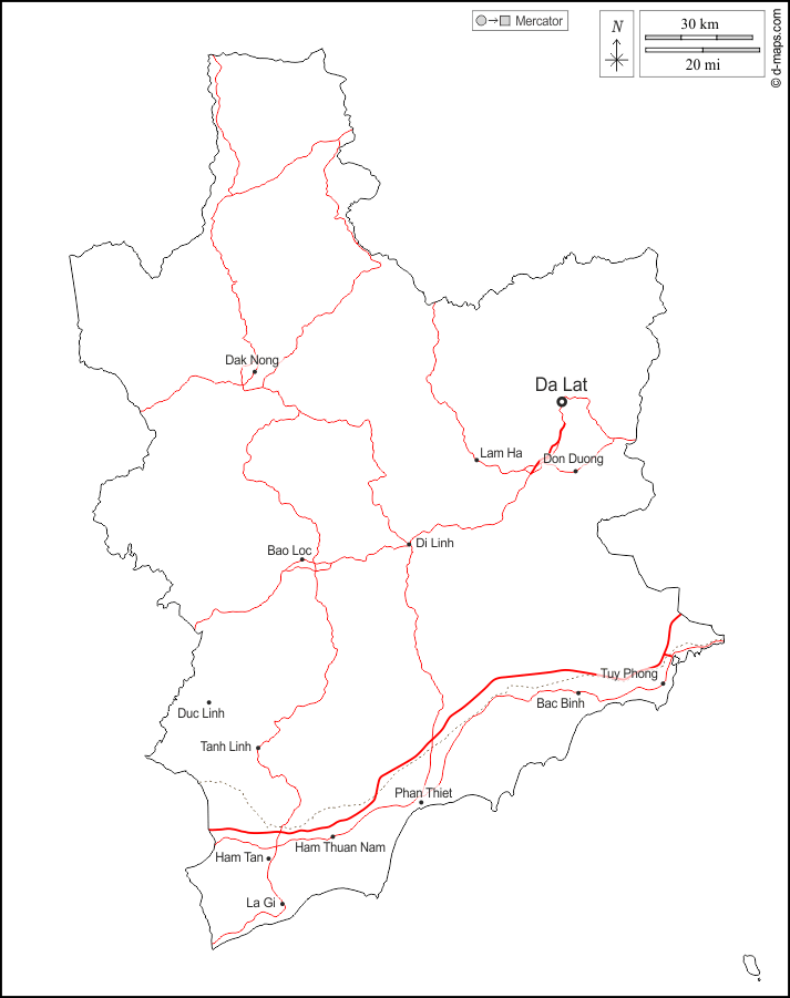 d-maps > Asia > Vietnam > Provincia di Lam Dong > contorni, principali città, strade, nomi, bianco