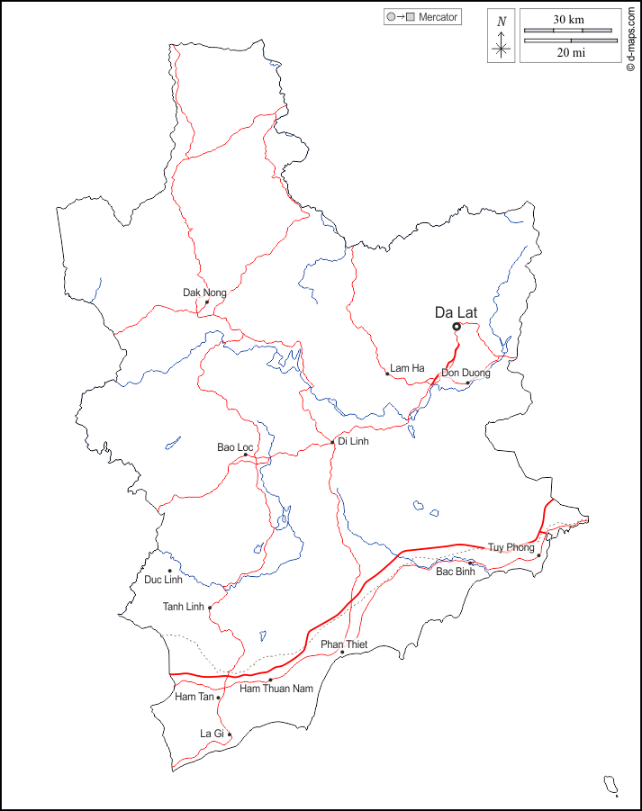 d-maps > Asia > Vietnam > Provincia di Lam Dong > contorni, idrografia, principali città, strade, nomi, bianco