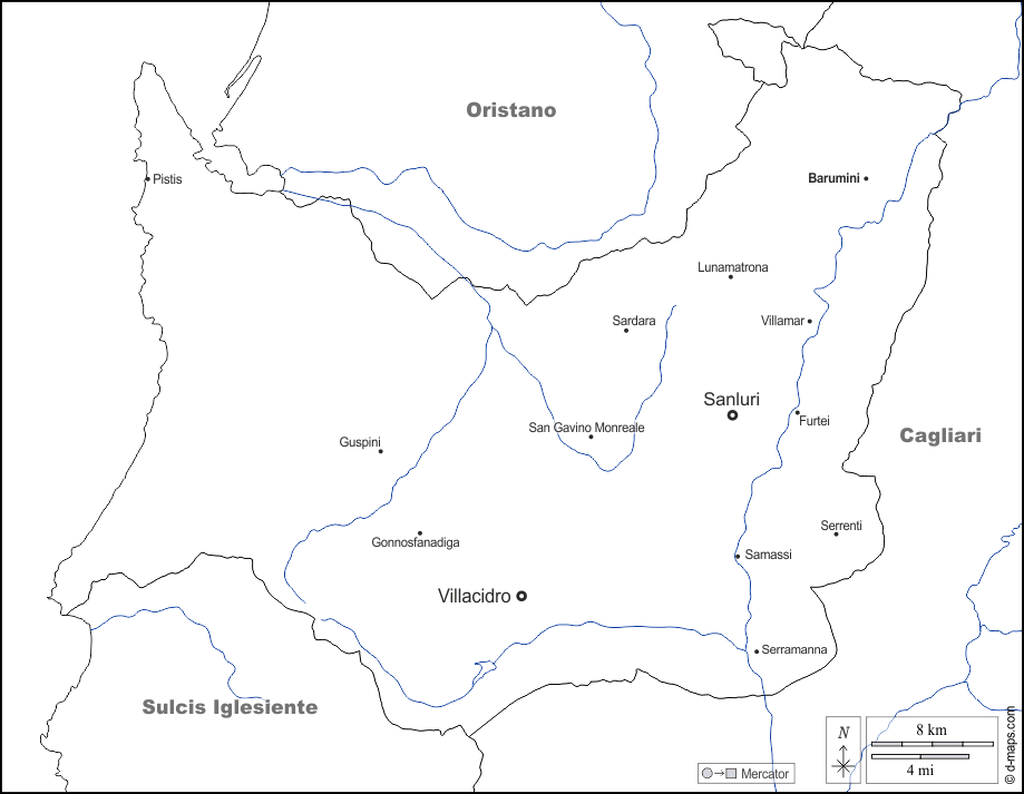 d-maps > Europa > Italia > Provincia del Medio Campidano > frontiere, idrografia, principali città, nomi, bianco