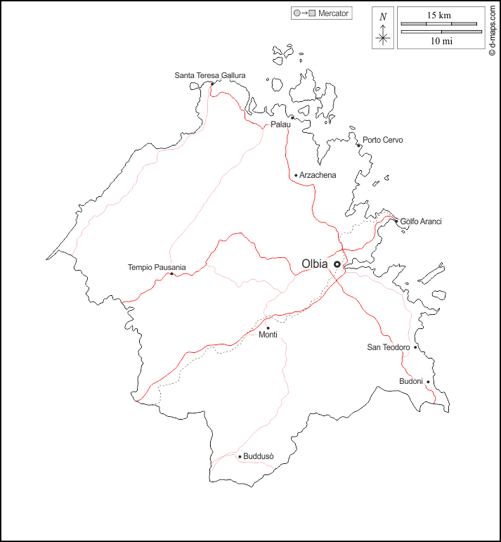 d-maps > Europa > Italia > Provincia della Gallura Nord-Est Sardegna > contorni, principali città, strade, nomi, bianco
