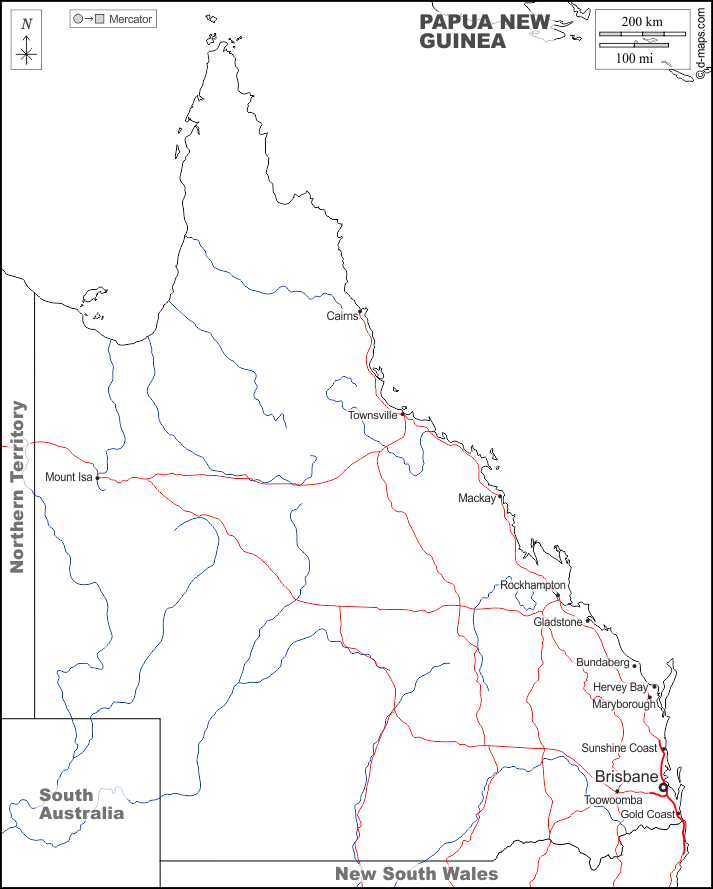 d-maps > Oceania > Queensland > frontiere, idrografia, principali città, strade, nomi, bianco