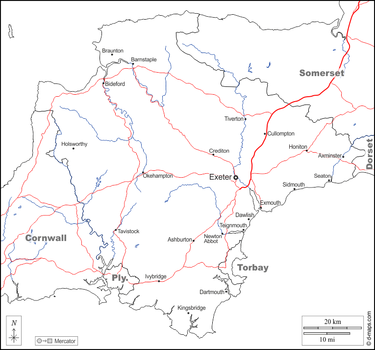 Europa > Regno Unito > Devon > frontiere, idrografia, principali città, strade, nomi, bianco