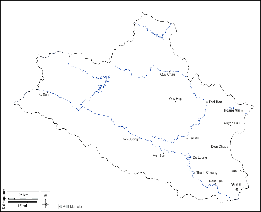 Anh Son - Con Cuong - Cua Lo - Dien Chau - Do Luong - Hoang Mai - Ky Son - Nam Dan - Quy Chau - Quy Hop - Quynh Luu - Tan Ky - Thai Hoa - Thanh Chuong - Vinh