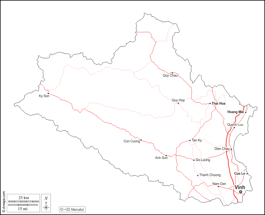 Anh Son - Con Cuong - Cua Lo - Dien Chau - Do Luong - Hoang Mai - Ky Son - Nam Dan - Quy Chau - Quy Hop - Quynh Luu - Tan Ky - Thai Hoa - Thanh Chuong - Vinh