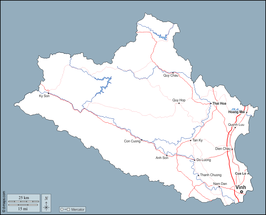 Anh Son - Con Cuong - Cua Lo - Dien Chau - Do Luong - Hoang Mai - Ky Son - Nam Dan - Quy Chau - Quy Hop - Quynh Luu - Tan Ky - Thai Hoa - Thanh Chuong - Vinh