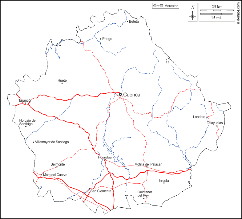 Europa > Espanha > Cuenca > contornos, hidrografia, principais cidades, estradas, nomes, branco