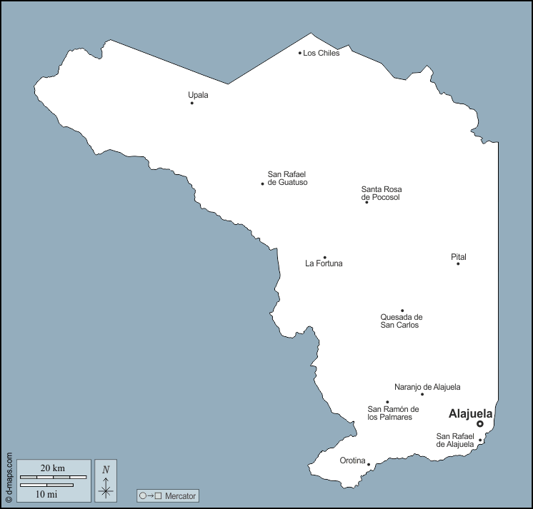 d-maps > Américas > Costa Rica > Província de Alajuela > contornos, principais cidades, nomes