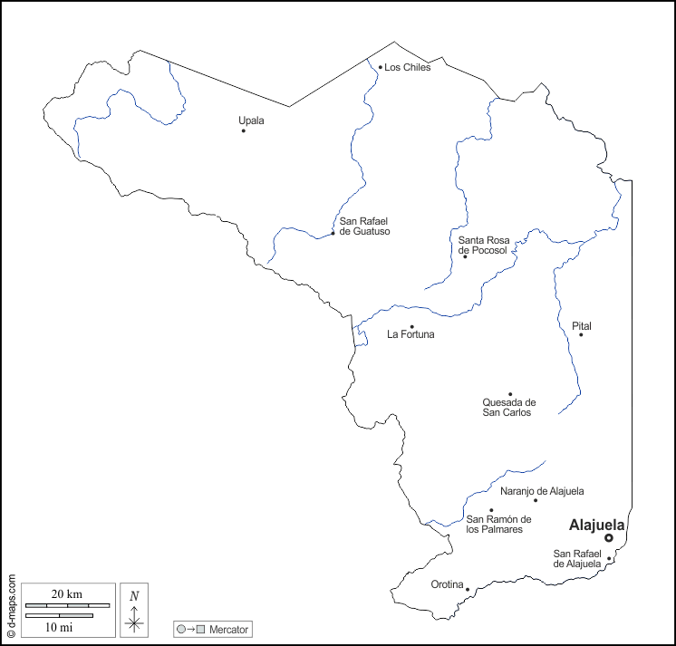 d-maps > Américas > Costa Rica > Província de Alajuela > contornos, hidrografia, principais cidades, nomes, branco