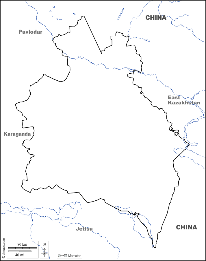 d-maps > Ásia > Cazaquistão > Região de Abai > costas, limites, hidrografia, branco