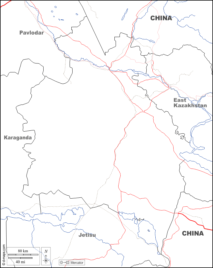 d-maps > Ásia > Cazaquistão > Região de Abai > fronteiras, hidrografia, estradas, branco