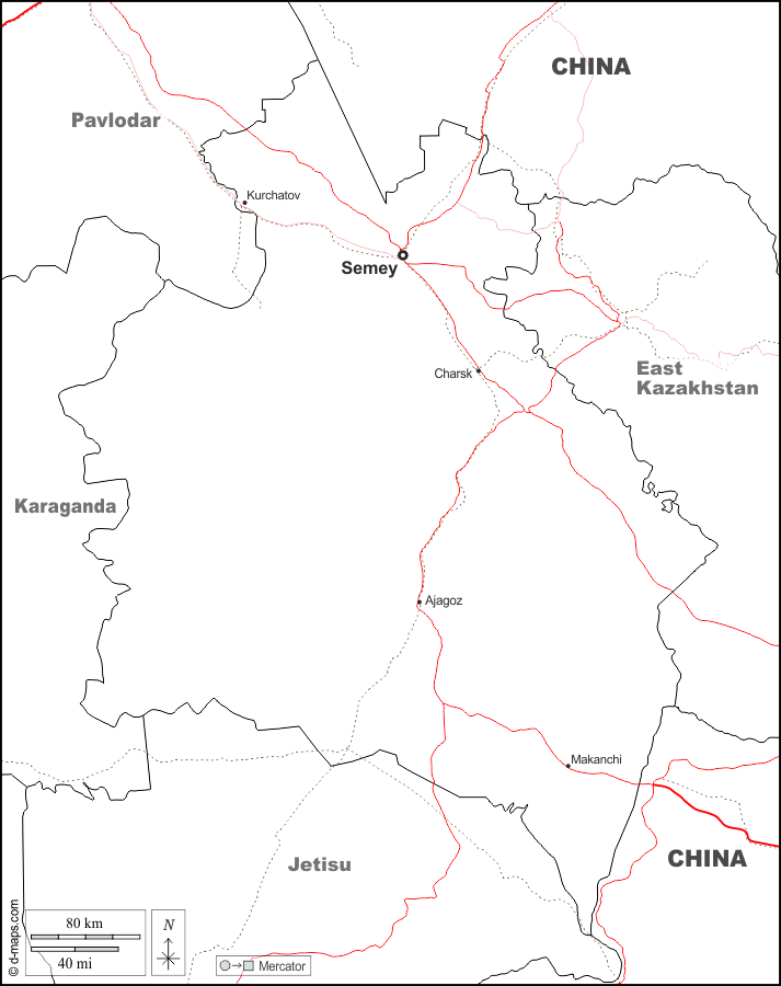 d-maps > Ásia > Cazaquistão > Região de Abai > fronteiras, principais cidades, estradas, nomes, branco
