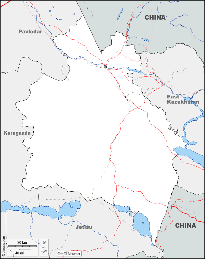 d-maps > Ásia > Cazaquistão > Região de Abai > fronteiras, hidrografia, principais cidades, estradas